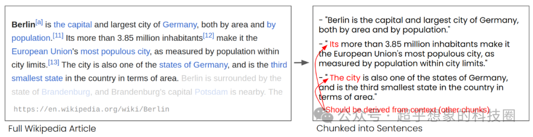 例如下面的这段文本,比如文档按下图右侧的方式切分,用户的问题是“柏林有多少居民”,很明显使用第二个片段可以回答是3.85百万,但由于它使用的是Its,导致这个片段有可能是检索不到的,或者即使检索到了,大模型也没有办法明确知道Its指代的是Berlin。