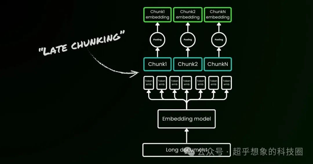 一整篇文档过Embedding模型不担心超长吗:所以此处Jina要求尽量使用支持长输入的Embedding模型,如果还是超长,那就按照Embedding模型支持的最大长度(例如8192)先切分,假设向量维度是1024,按8192切分后得到7个片段,最终把这7个片段的8192 个维度为1024的向量拼接起来,然后还是按2中提到的方法获取片段的Embedding。这里面其实涉及到很多操作问题,首先比如是按8192切分,其实是token的长度是8192,而不是句子长度,其次是切分后字符的索引要和token的索引对应,最后如果超过Embedding模型的最大长度,需要考虑模型的第一个位置是否有特殊字符,要把它移除。