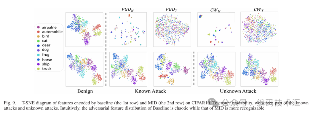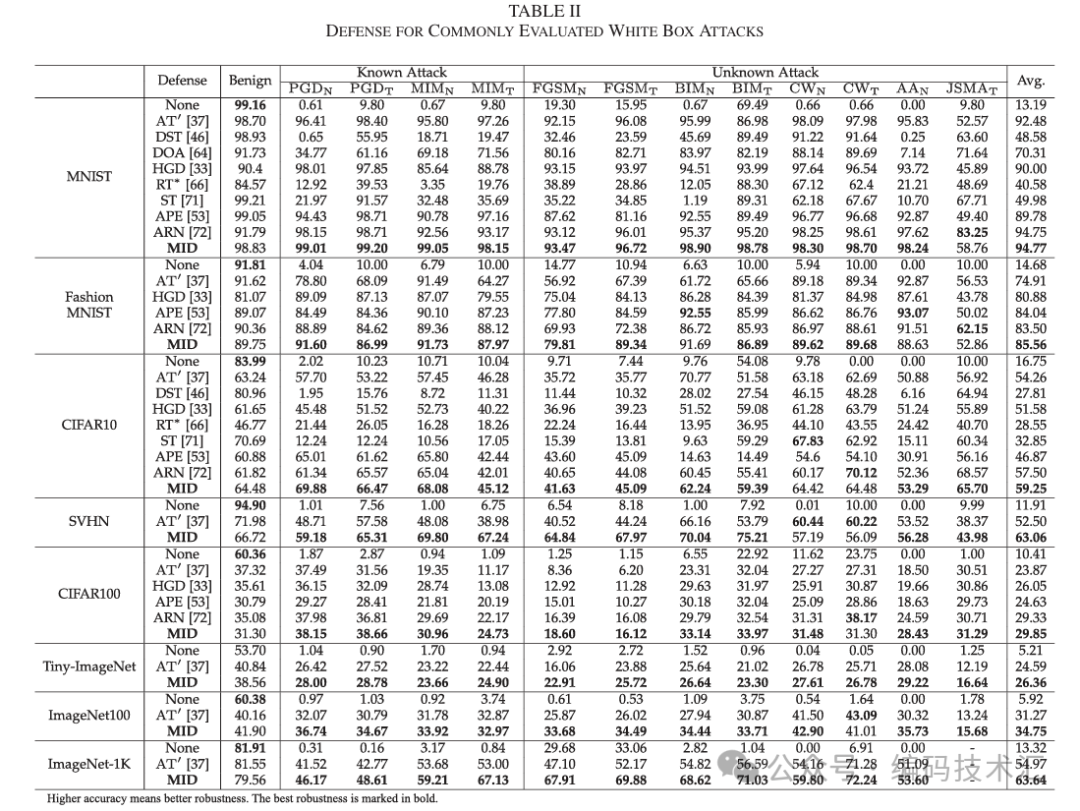 对已知和未知攻击的鲁棒性:MID 在白盒和黑盒攻击下均表现出最佳的鲁棒性,对训练阶段使用的已知攻击(如 PGD 和 MIM)以及未见过的攻击(如 FGSM、BIM、CW、AA 和 JSMA)都能有效防御。