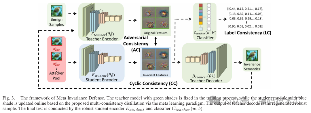 提出了一种包含对抗一致性、标签一致性和循环一致性约束的多一致性蒸馏协议,有助于学习攻击不变特征。