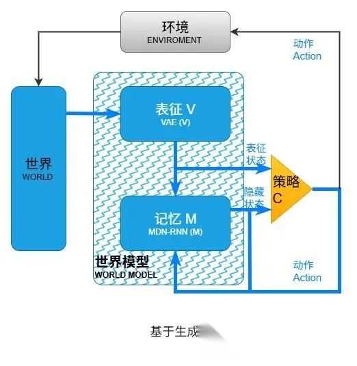 到2018年,Google的David Ha等在论文《World Models》提出了一种通过神经网络构建“世界模型”的方法,用于加强学习环境的建模和策略训练。简单而言,David Ha提出的世界模型是一个生成式神经网络,可以通过无监督学习(VAE,V)快速地获得对环境的空间和时间的压缩表征。该模型通过记忆网路(MDN-RNN,M)来理解和预测环境的状态迁移,并模拟环境中的未来变化。智能体通过一个非常简单且紧凑的策略网络(C)模拟不同的未来状态来做出决策以完成任务。