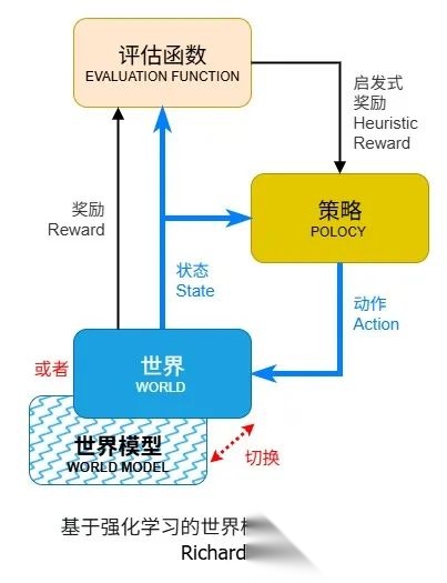 萨顿在Dyna架构中,提出了基于真实经验构建或学习一个现实世界环境(World)的动态模型,即“世界模型”,该模型可用来描述状态转移和奖励函数;其次,通过与现实世界环境的交互,使用强化学习算法直接调整评估函数和更新策略。Dyna架构中通过学习和使用动态模型(世界模型),实现在虚拟的内部环境中进行试验和规划,成为世界模型思想的重要开端。