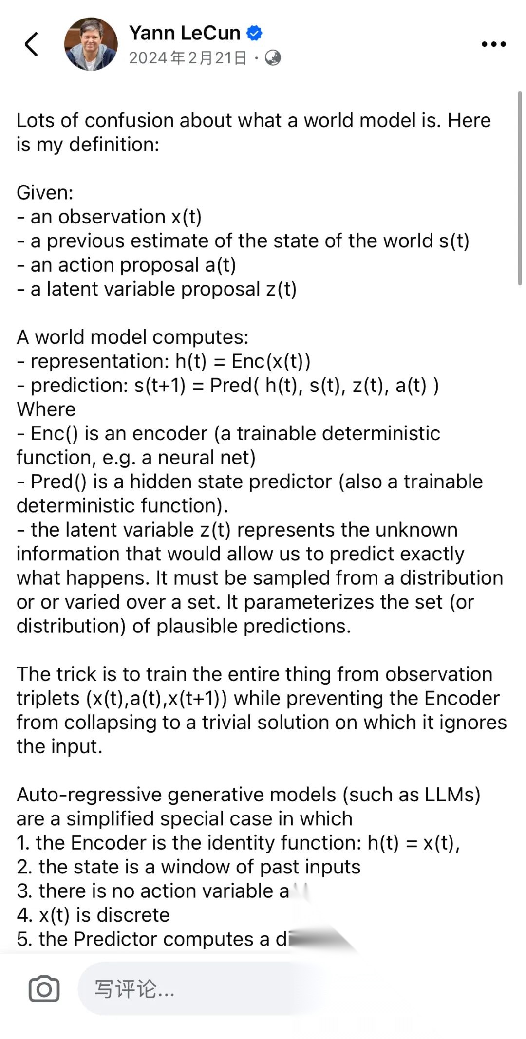 身在Meta的Yann LeCun近来多次直言不讳地批判了当前人工智能对大型语言模型的过度依赖。他认为大预言模型对逻辑的理解非常有限,不理解物理世界,没有持久的记忆;既不能进行常识性推理,也不能进行层次化的规划。他希望未来AI研究聚焦于模型架构的创新,而非仅仅依赖于扩大模型规模和数据量。他将“世界模型”看作AI迈向自主智能的关键技术路径,其核心是从感知到抽象再到预测与规划,实现机器的“心智模拟”和因果推理能力,推动AI研究从基于模式匹配向基于理解和推理转变。要是你喜欢算法编程,也可以参考Yann LeCun之前在他脸书账号下用伪码描述的世界模型。