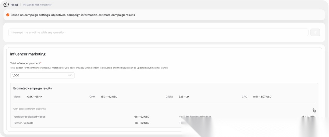 这些事难度虽然不大,但却极其耗费时间和人的心力。现在,通过 Head AI,我只需要输入自家产品的链接和预算,Head AI 就可以独立完成整个的营销活动。