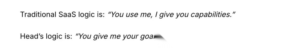 传统 SaaS 的逻辑是:你用我,我给你赋能。而 Agent 的逻辑是:你给我目标,我给你交付结果。