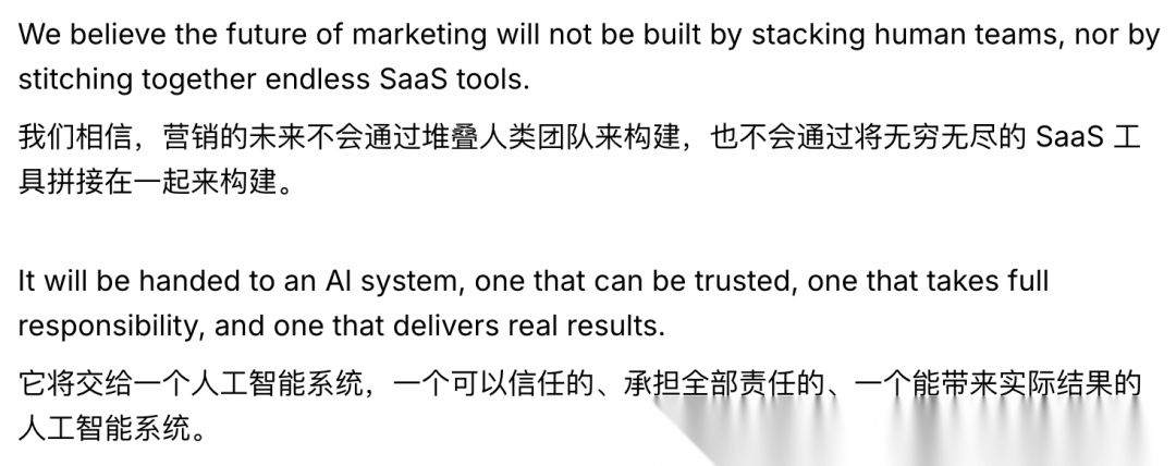 用不了多久,真的,用不了多久。我相信,对于绝大部分中小公司来说,根本不需要一个成建制的市场团队,甚至就算保留,也只需要一两个人就够了,剩下的事交给 AI 去干。