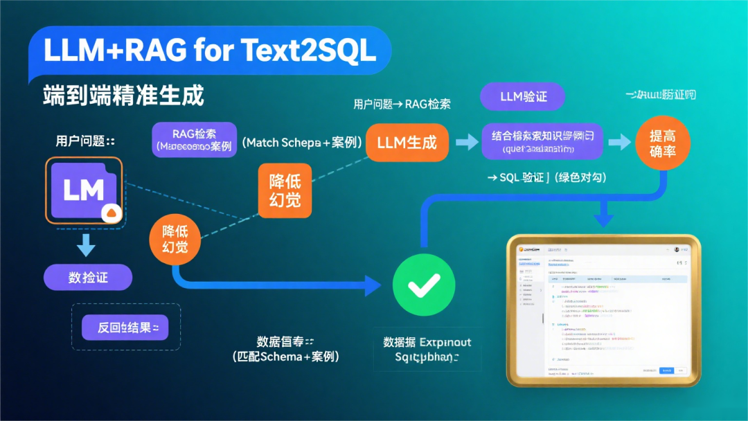 RAG(检索增强生成):通过检索数据库结构、字段含义等信息,提升生成SQL的准确性,避免“模型幻觉”。