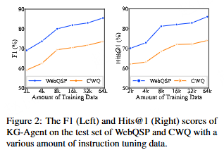 图 2:不同指令微调数据量下,KG-Agent 在 WebQSP 和 CWQ 测试集上的 F1 分数(左图)和 Hits@1 分数(右图)