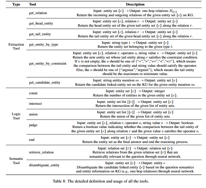 :用于辅助获取知识图谱中的信息。结合知识图谱的基本数据类型,我们设计了 5 种工具,分别支持获取关系(get_relation)、头实体 / 尾实体(get_head_entity/get_tail_entity),以及根据特定类型或约束条件获取实体(get_entity_by_type/get_entity_by_constraint),操作对象可为某一实体集或其他输入信息(如关系、类型)。