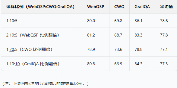 实验发现,仅从现有数据集中采样 10k(10000 条)样本,就足以让骨干大语言模型学习到自主决策能力。在此基础上,我们进一步开展消融实验:在保持指令微调数据总量不变的前提下,探究采样比例对智能体性能的影响。具体而言,我们在保持另外两个数据集比例不变的情况下,将其中一个数据集的采样比例翻倍,并评估了 WebQSP、CWQ 和 GrailQA 数据集上的智能体性能,结果如表 6 所示。可以看出,随着某一数据集采样比例的增加,智能体在该数据集上的性能会持续提升;但对于三个数据集的平均性能而言,所有比例变体的结果均低于我们所选的原始比例。这表明,我们选择的采样比例能让大语言模型平衡并掌握更全面、更通用的能力。