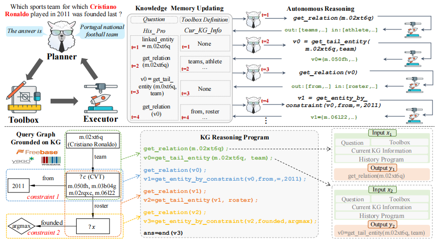 - 提出一套基于 “工具选择 - 记忆更新” 的自主迭代机制,整合微调后的大语言模型、多功能工具箱、基于知识图谱的执行器及知识记忆模块,实现对知识图谱的自主推理。