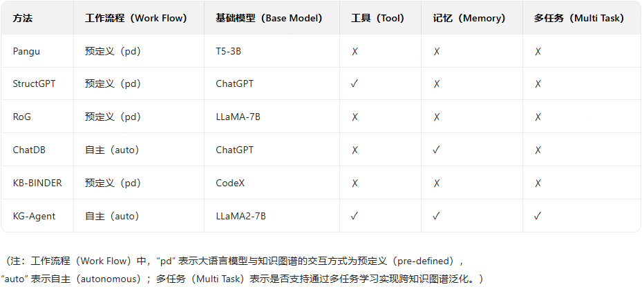 本文提出的 KG-Agent 是首个支持 “大语言模型 - 知识图谱复杂交互” 的自主智能体框架,且融合了工具与记忆增强功能。此外,与 KB-BINDER、StructGPT、ChatDB 等方法使用的骨干模型相比,我们仅通过对一个更小的 70 亿参数开源大语言模型(LLaMA-7B)进行指令微调,就实现了这一自主智能体。同时,智能体的指令微调数据来自多个知识图谱(如 Wikidata、Freebase),这有助于 KG-Agent 学习在不同知识图谱上的通用自主决策能力。