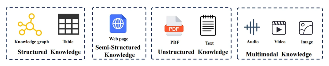 Figure 1: RAG 系统整合的多种知识类型,涵盖结构化、半结构化、非结构化和多模态知识。[Source[2]]