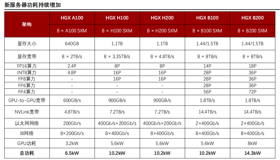 具体表现为:FP8/FP6/FP4等低精度算力指数级上升,标志AI推理需求正主导算力体系设计重心;NVLink互联和GPU-to-GPU通信能力翻倍增长,有效缓解大模型并行训练中的通信瓶颈;而单节点总功耗从6.5kW跃升至14.3kW,意味着智算服务器已成为数据中心能耗与散热规划的核心负载单元,传统散热、电力系统将面临系统性重构压力。