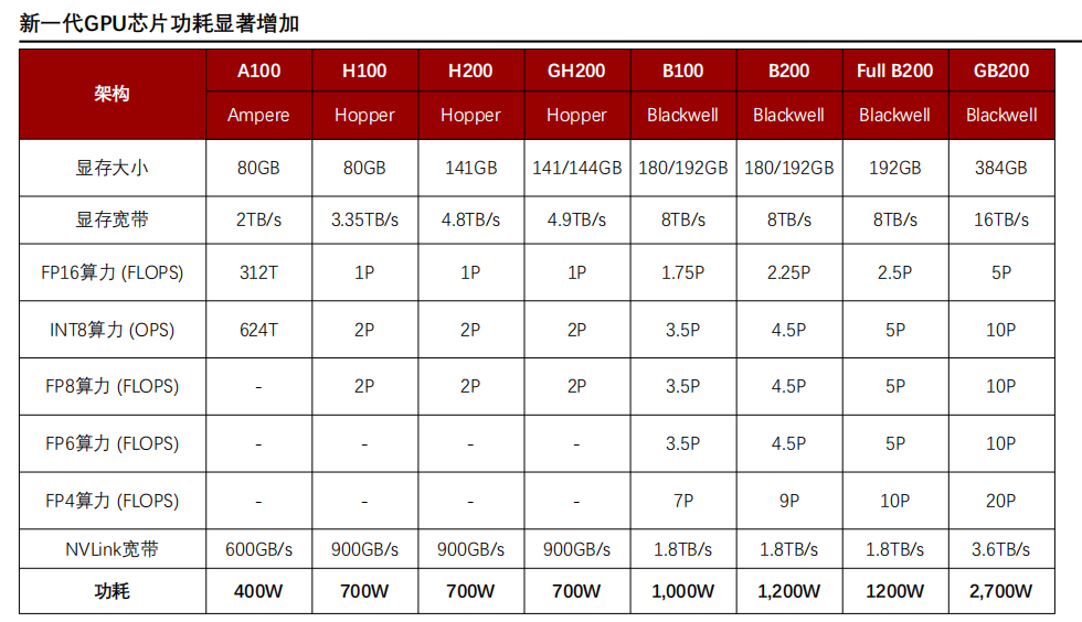 核心算力指标如FP16、INT8、FP8等在Blackwell架构下呈现倍数级增长,尤其在FP4/FP6低精度计算能力上显著提升,反映出面向AI大模型推理与训练的新架构已全面向极致性能和高能效比优化。此外,显存带宽从A100的2TB/s提升至GB200的16TB/s,NVLink也翻倍扩展至3.6TB/s,旨在支撑大模型分布式并行训练需求。而功耗亦同步激增至2700W,表明下一代GPU将显著推高智算中心在电力、散热和系统设计方面的基础设施门槛,对系统集成商提出更高挑战,也加速数据中心向液冷与高密度部署形态演进。