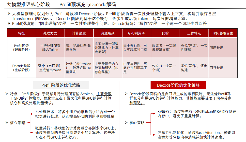 大模型推理分为并行Prefill与增量Decode两阶段,分别依托模型并行与批量吞吐、以及KV缓存与注意力优化,实现了高效低延迟的推理流水线。