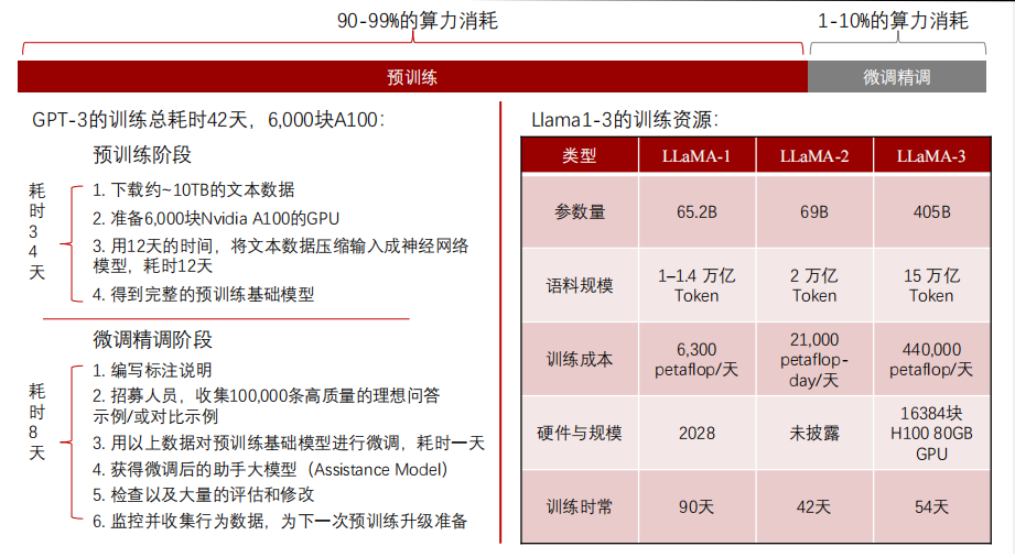 以GPT-3为例,其在6,000块A100 GPU上投入约34天完成预训练,后续微调阶段又耗时8天,总计42天;LLaMA系列则更具代表性:LLaMA-1在约2,028块GPU上用90天训练1-1.4万亿Token,LLaMA-2则在42天内完成2万亿Token的预训练,LLaMA-3动用约16,384块H100 GPU在54天内训练15万亿Token。