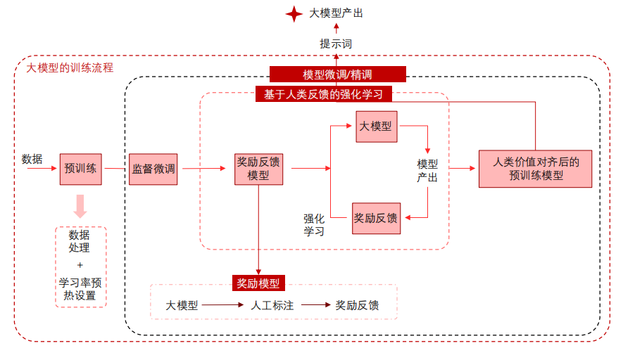 大模型训练的全流程框架,是一个先通过预训练和监督微调构建模型的基础能力,再通过人类反馈强化学习完成关键价值对齐的系统性工程。