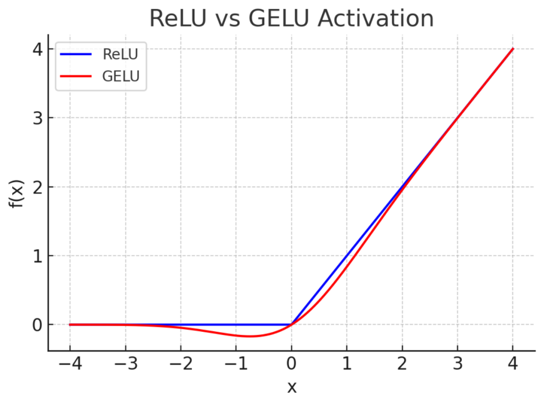 在两层(升维再降维)前馈神经网络 FFN 之间通常会加入非线性激活函数以赋予模型非线性表示能力。常见选择包括