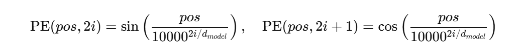 Transformer 需要位置信息来保持序列顺序。原始论文采用了基于不同频率的正弦/余弦函数构造的固定位置编码(sin/cos),具体函数为: