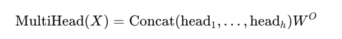 对于多头注意力(h 个头),每个头在子空间上做上述计算,最后拼接各头输出再做一次线性变换: