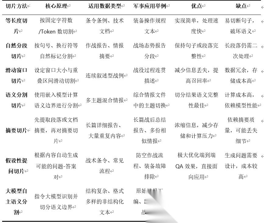 军事文本数据预处理与切片是构建高效军事向量知识库的关键环节。针对不同类型的军事文本数据,需要采用差异化的切片策略,以在向量化后保持语义完整性并提高检索命中率。以下是几种核心的切片方法及其应用场景