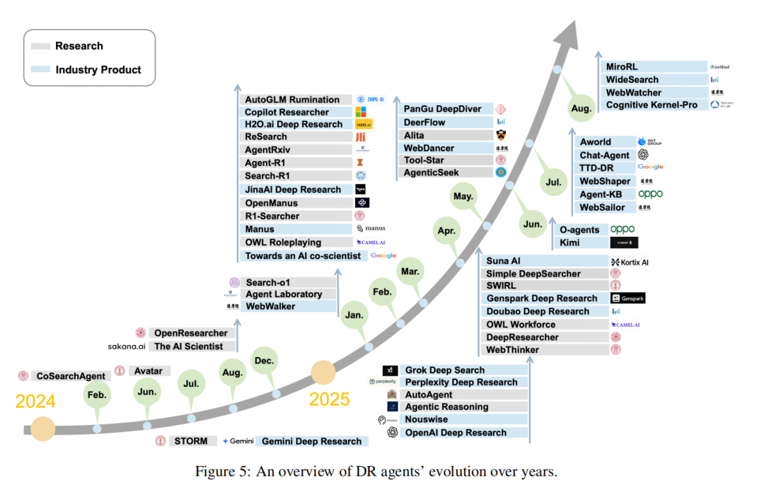 近年来,大型语言模型(LLMs)的突破性进展,推动了具备自主研究能力的复杂 AI 智能体快速崛起。早期模型如 GPT-3 [11],主要聚焦于孤立任务,比如问答和机器翻译;随后,通过与外部工具的结合,WebGPT [73] 等模型实现了自主浏览网页、整合多源信息的能力;而如今,一类更先进的自主系统 —— 深度研究(DR)智能体应运而生,典型代表包括行业领先的 OpenAI DR [78]、Gemini DR [33]、Grok DeepSearch [124] 和 Perplexity DR [81]。这类智能体在 LLMs 的基础上大幅拓展能力边界,融入了高级推理、动态任务规划以及与网络资源、分析工具的自适应交互功能。
