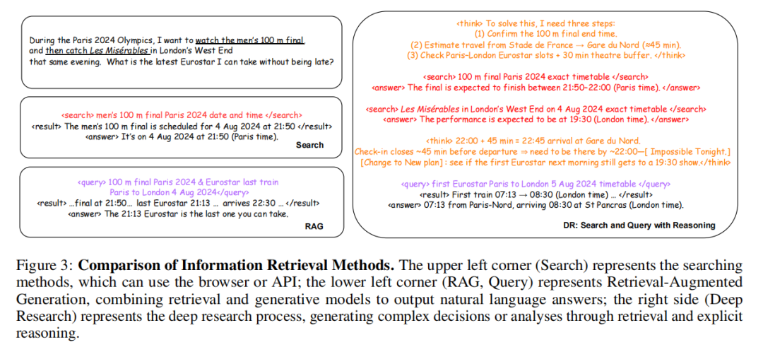 但智能体化 RAG 仍面临挑战:动态推理过程的计算开销平衡 [95]、智能体行为与用户意图的对齐 [132]、自适应工作流的可解释性 [42,95]。更关键的是,即使是先进的智能体化 RAG,仍依赖预存或定期更新的语料库,难以应对实时、快速变化或长尾信息需求。为突破这一局限,需将外部 API 与网页浏览能力融入 RAG 架构 —— 这也正是深度研究(DR)方法的核心目标:进一步提升检索的全面性与适应性。