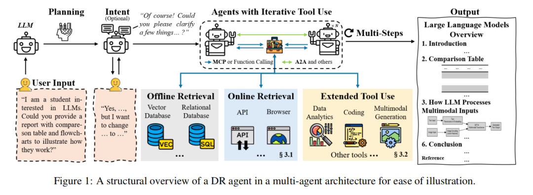 图 1 展示了一个典型的深度研究智能体架构,清晰呈现了从用户输入到最终输出的完整工作流:从用户输入出发,经过可选的规划与意图澄清环节,进入迭代式工具使用阶段(包括离线检索 —— 向量数据库与关系型数据库、在线检索 ——API 与浏览器,以及扩展能力 —— 数据分析、编码等),最终生成多模态内容,并输出结构化的综合报告。
