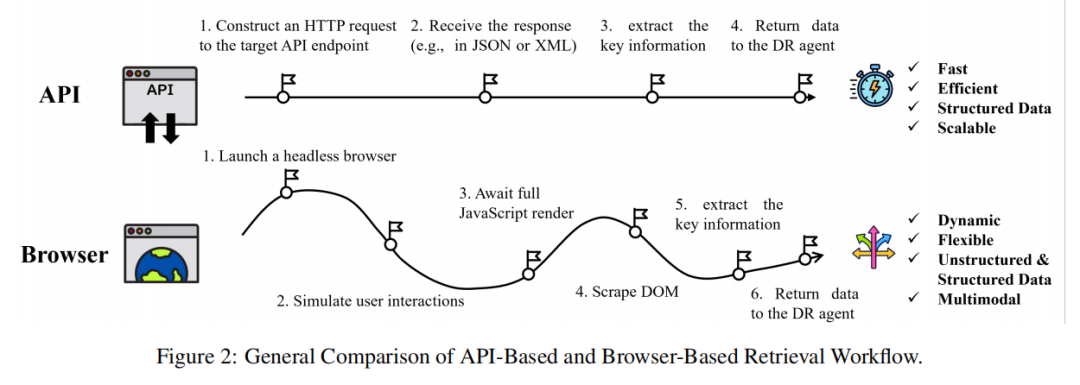 基于浏览器的检索能获取 API 无法触及的实时、嵌套内容,但也存在延迟高、资源消耗大、页面多样性与错误处理复杂等问题。因此,深度研究智能体若采用 “API 高效检索 + 浏览器全面探索” 的混合架构,往往能实现更优性能。