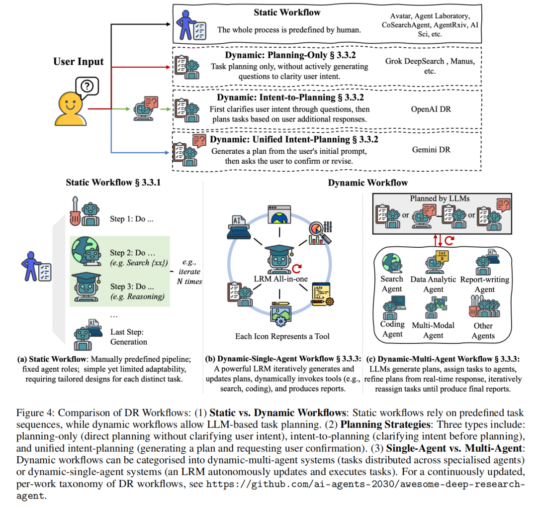- • 提出一套统一的分类框架(图 4),基于工作流特征(静态 vs 动态)、规划策略和智能体架构(单智能体 vs 多智能体)对深度研究系统进行分类,衔接不同技术方法与当前行业解决方案;