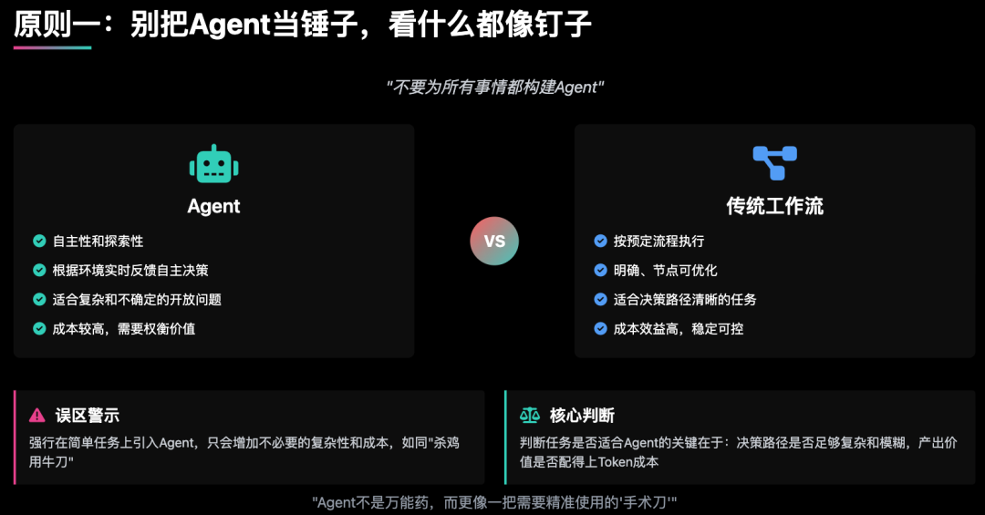 举个例子,如果你的场景是每单任务预算只有几毛钱的高并发客服系统,那么用传统工作流解决 80% 的常见问题,远比用 Agent 去追求 95% 的覆盖率要明智得多。
