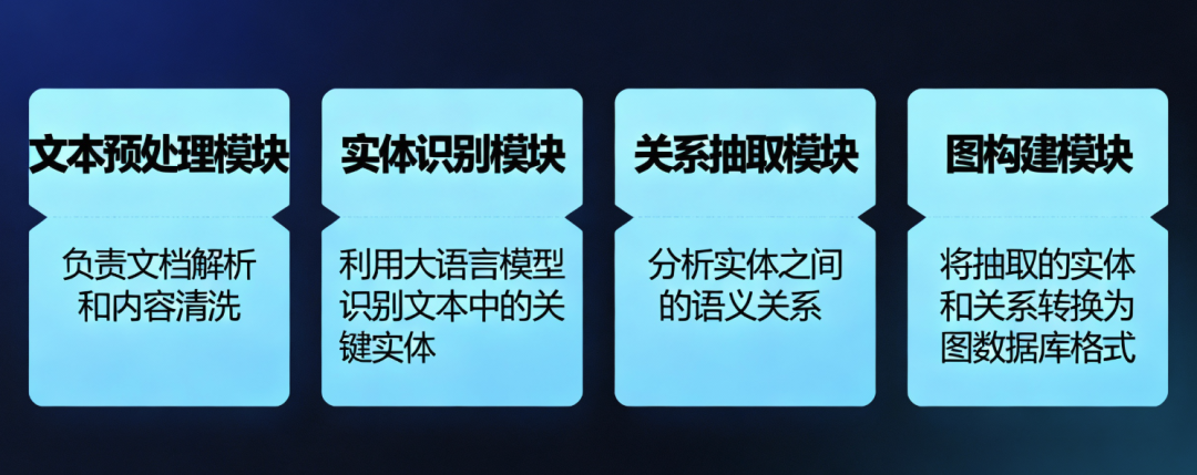 基于大语言模型的知识图谱构建系统,主要包含四个核心组件:文本预处理模块负责文档解析和内容清洗;实体识别模块利用大语言模型识别文本中的关键实体;关系抽取模块分析实体之间的语义关系;图构建模块将抽取的实体和关系转换为图数据库格式。