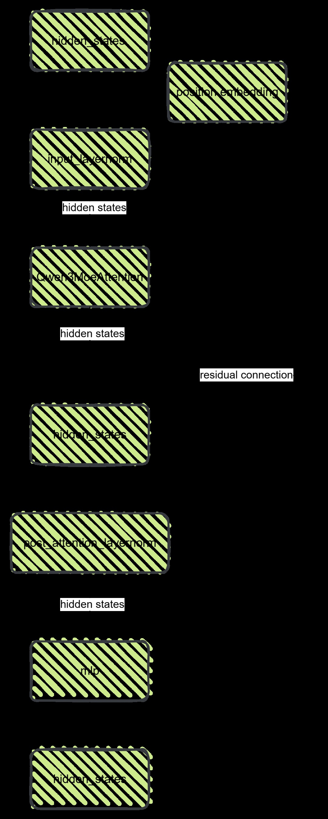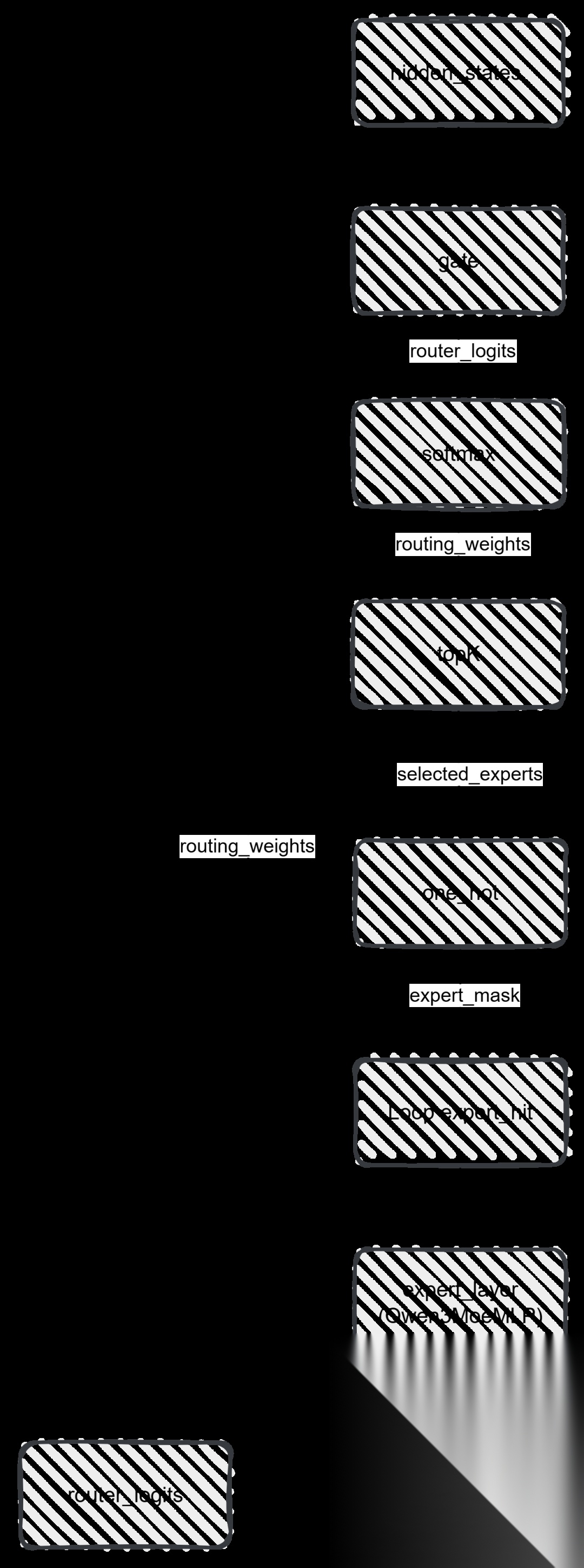 讲了这么久的流程和代码,那Qwen3的moe究竟藏在哪里呢?看了之前的文章就知道,moe层主要的改变是FNN层,多了一个门控和若干个专家。我们来看下这一部分代码和下面的流程图,就一目了然了: