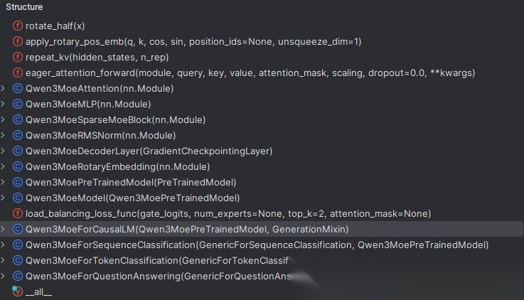 现在我们来看下阿里开源的Qwen3MoE模型怎么实现的?下图是Qwen3MoE开源的代码结构: