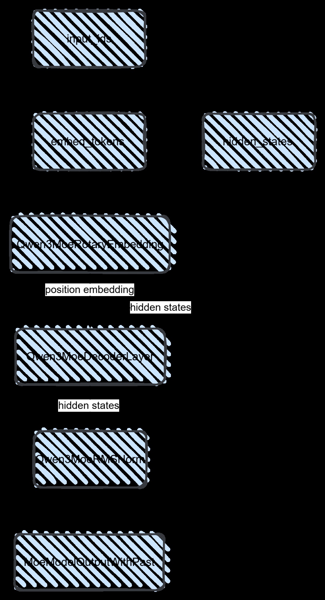 结构图中包含了Attention、MLP、RMSNorm、Trained等模块,我们从则Qwen3MoeForCausalLM类开始一步步解析整个过程,下面为其代码片段,为了更好的理解,整理成一个图,方便理解。