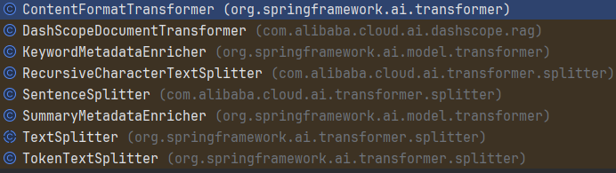 DocumentTransformer 可以对一批文档进行转换处理,它是一个接口,主要实现其transform方法,将一组Document转换为另外一组Document。其实现类有: