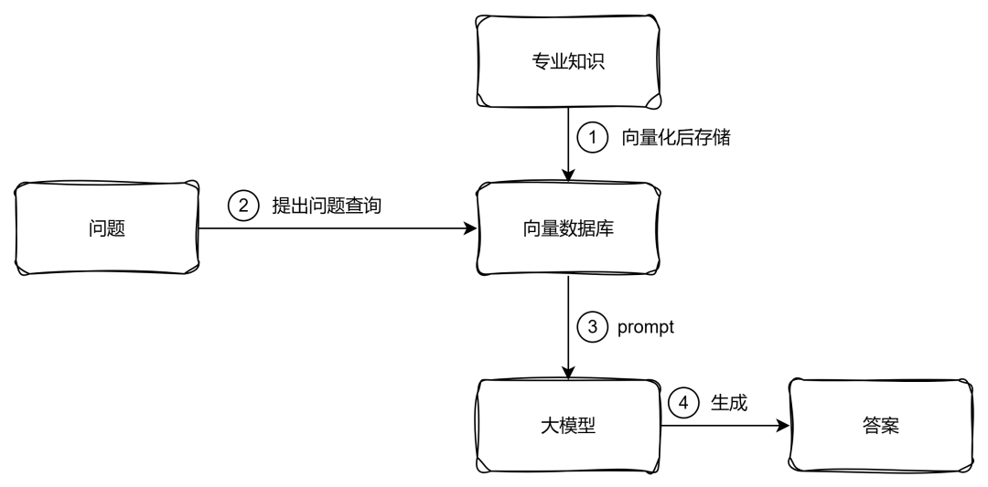 这样,当用户提问的时候,就会首先到 向量数据库中对问题进行相似度搜索,然后将搜索到的相关提示词再组装后发送给大模型,最终大模型生成答案。