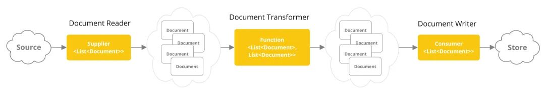 public interface DocumentReader extends Supplier<List<Document>> { default List<Document> read() { return (List)this.get(); }}public interface DocumentTransformer extends Function<List<Document>, List<Document>> { default List<Document> transform(List<Document> transform) { return (List)this.apply(transform); }}public interface DocumentWriter extends Consumer<List<Document>> { default void write(List<Document> documents) { this.accept(documents); }}