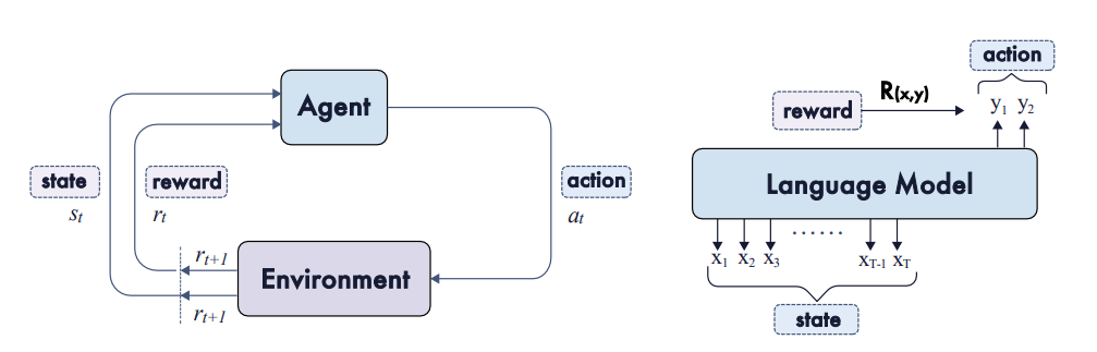 本图展示了强化学习(RL)的基本组件以及语言模型(LMs)作为强化学习代理的配置方式。图中首先介绍了强化学习的基本概念,包括状态(State)、动作(Action)、奖励(Reward)和策略(Policy)。在强化学习的框架中,代理(Agent)与环境(Environment)进行交互,代理根据当前状态选择动作,环境则根据代理的动作提供新的状态和奖励。这一过程通过马尔可夫决策过程(MDP)来形式化描述,其中状态空间(S)、动作空间(A)、转移概率(P)、奖励函数(R)和折扣因子(γ)是其核心组成部分。