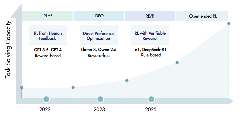本图展示了强化学习(RL)在大型推理模型(LRMs)中的发展历程和主要方法。图中首先回顾了基于人类反馈的强化学习(RLHF)和直接偏好优化(DPO)这两种主要的RL方法,它们在对齐人类偏好方面取得了显著成果。然而,随着研究的深入,人们发现这些方法在解决复杂逻辑任务(如数学和编程)方面存在局限性。因此,研究者们开始探索新的方向,即通过可验证的奖励信号(RLVR)来激励模型的推理能力。这种方法在DeepSeek-R1和OpenAI o1等模型中得到了成功应用,显著提升了模型在数学和编程任务上的表现。