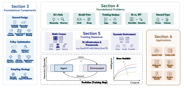 本文采用系统性综述的研究方法,全面梳理了强化学习(RL)在大型推理模型(LRMs)中的应用。首先,文章从基础组件入手,深入分析了奖励设计、策略优化和采样策略等关键要素,并探讨了这些组件在不同研究方向中的技术路径。接着,文章聚焦于RL在LRMs中面临的几个基础性问题,如RL的角色、与监督微调的比较、模型先验等,通过对比和分析,揭示了这些问题的复杂性和研究现状。此外,文章还详细考察了RL训练所需的资源,包括静态语料库、动态环境和RL基础设施,评估了这些资源对训练效果的影响。在应用层面,文章广泛覆盖了RL在编码任务、代理任务、多模态任务、多智能体系统、机器人任务和医疗任务等多个领域的实际应用,总结了不同领域中RL的应用模式和挑战。