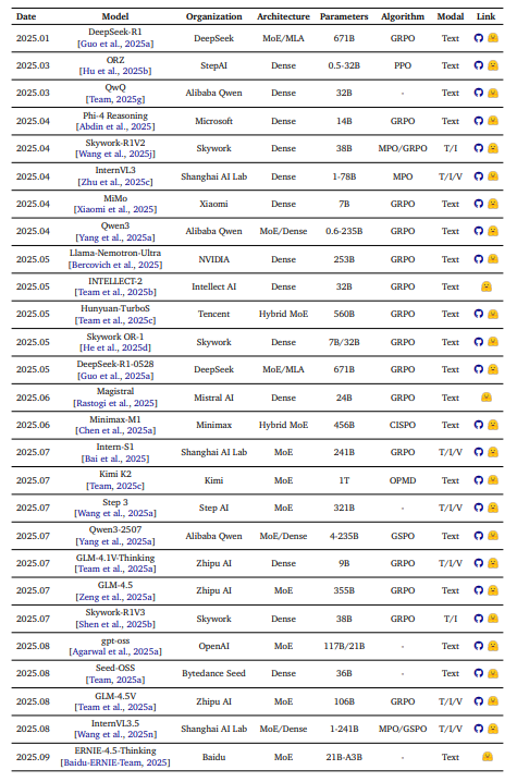 本表提供了关于开源强化学习(RL)训练的大型语言模型(LLMs)的详细信息。这些模型在不同的组织、架构、参数规模、算法和模态方面存在差异,反映了当前RL在LLMs领域研究的多样性和进展。表中首先列出了模型的名称和发布日期,这有助于追踪模型的发布时间和发展趋势。接着,表中指出了每个模型的组织来源,如清华大学、上海人工智能实验室、阿里巴巴等,这些信息有助于了解哪些机构在该领域处于领先地位。在架构方面,本表展示了不同模型采用的架构类型,包括密集型(Dense)、混合专家(MoE)、稀疏注意力(Sparse Attention)等。这些架构选择对模型的性能和效率有重要影响,例如,MoE架构能够通过专家混合提高模型的表达能力和计算效率。在架构方面,本表展示了不同模型采用的架构类型,包括密集型(Dense)、混合专家(MoE)、稀疏注意力(Sparse Attention)等。参数规模是表中的另一个关键信息,它显示了模型的大小,从几亿到数千亿不等。参数规模直接影响模型的复杂性和推理能力,较大的模型通常能够处理更复杂的任务,但也需要更多的计算资源。