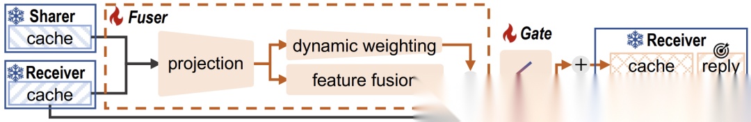在传统的LLM推理中,Receiver基于自身的KV-Cache生成响应。而在C2C中,我们首先将Sharer的KV-Cache通过一个称为 Fuser 的网络,与Receiver的KV-Cache进行融合,形成一个新的、增强版的缓存,再交给Receiver用于生成。