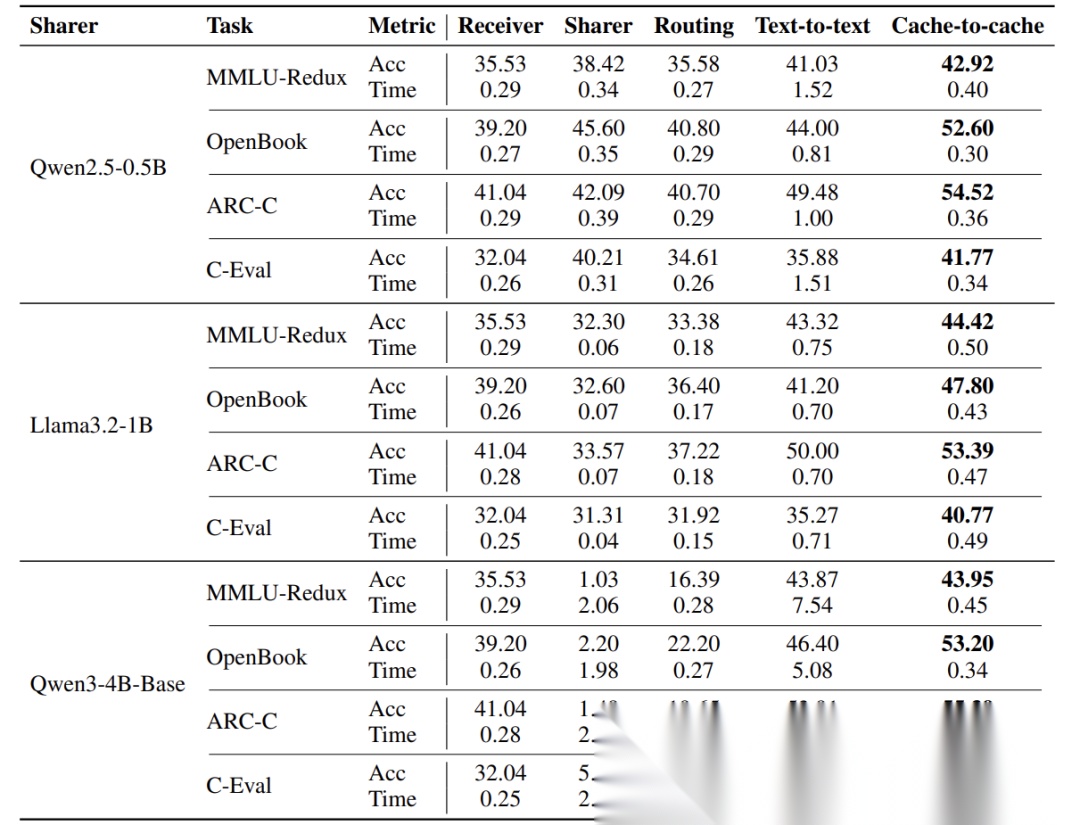 C2C的另一个突出优势是速度。由于省去了中间文本的生成与解析,C2C实现了 平均2.0倍的加速,在某些场景下(如Sharer为Qwen3-4B Base时)甚至达到14.41倍!