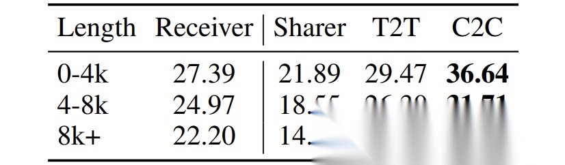 上表显示,在LongBenchV1的长文本任务中,C2C在不同文本长度区间(0-4k, 4-8k, 8k+)均稳定优于T2T。