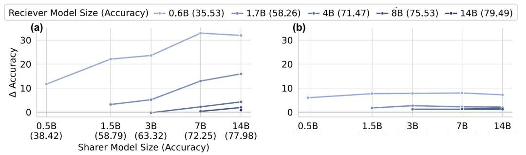 涵盖不同模型家族(Qwen、Llama、Gemma)、不同规模(0.6B~14B)、不同专业领域(通用、代码、数学)以及不同训练阶段(预训练、指令微调)。例如,用Qwen2.5-Math作为Sharer,Qwen3-0.6B作为Receiver,测试学科知识传递。 - 基线方法: