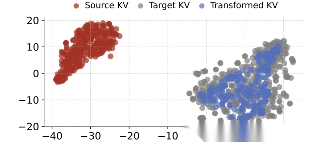 图3通过t-SNE可视化显示,转换后的KV-Cache完美落入目标模型的表示空间,证明跨模型缓存转换是可行的。