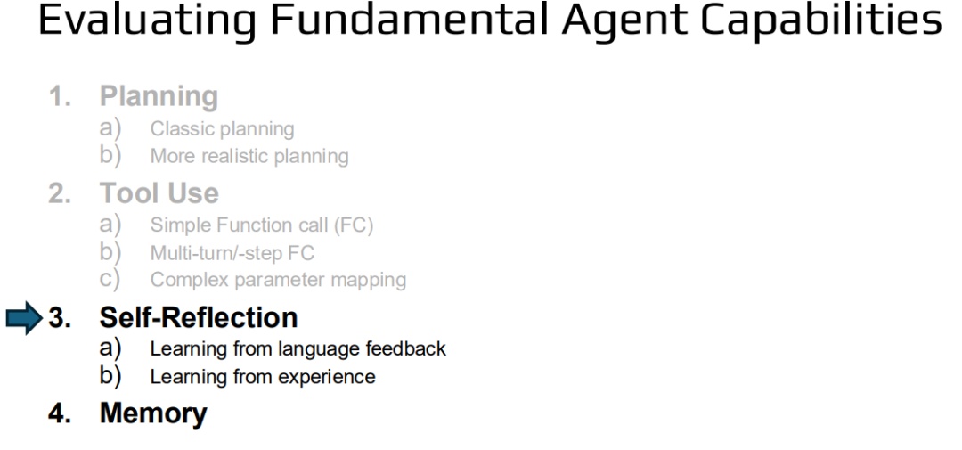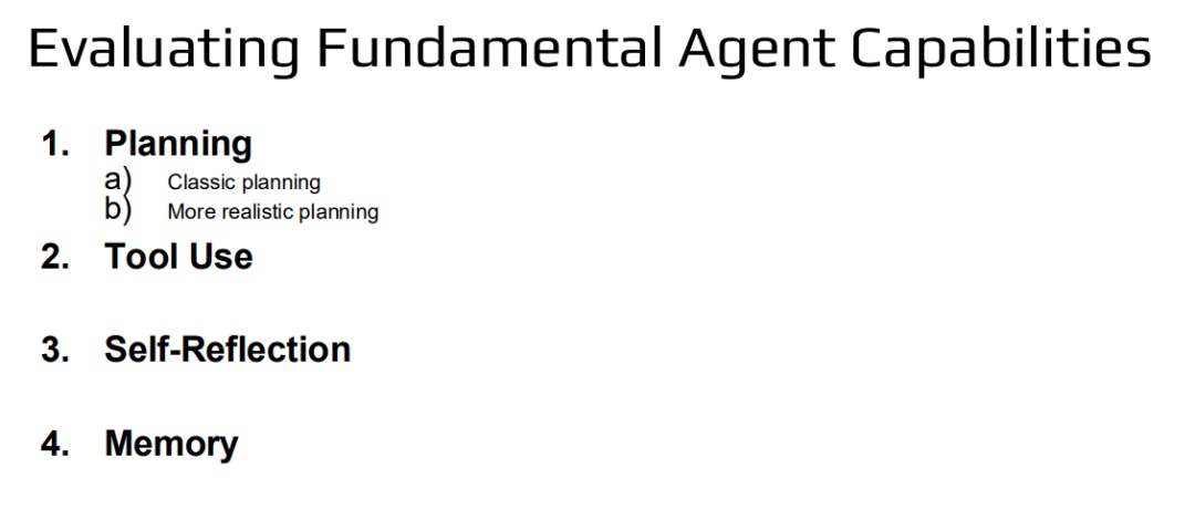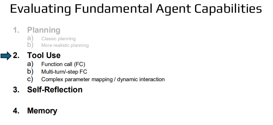 我们将讨论四大核心智能体能力:规划与多步骤推理、函数调用与工具使用、自我反思和记忆。每项能力的评估内容包括: