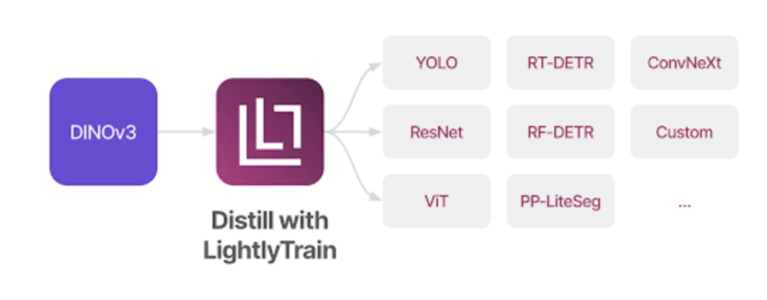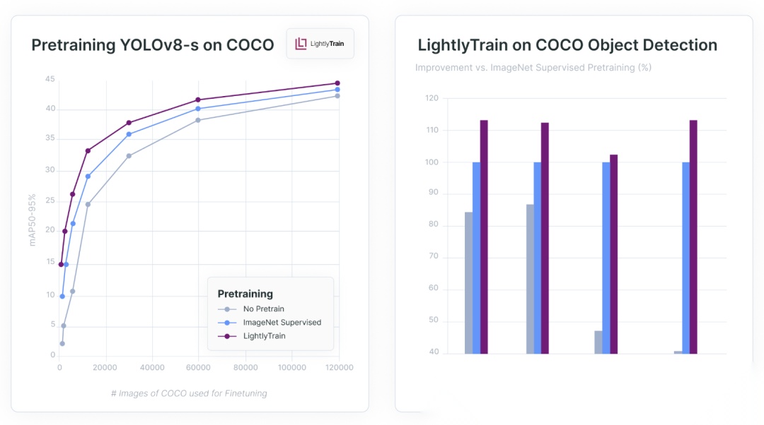 比如最近开源的一个自监督训练框架lightly-train,这个框架通过无标签样本数据的自监督训练实现预训练将类似dino v3这类视觉大模型蒸馏到类似yolo这类小模型中,然后再基于这个基于行业数据的预训练模型再进行有标签的微调训练,也就是我们平时使用yolo都会做的工作,这样使用「预训练蒸馏+微调」的组合之后,可以使得yolo使用更小的微调数据就可以取得更高的精度。